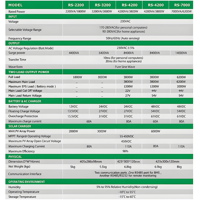 RS SERIES 2200VA/1800W 3200VA/3000W 4200VA/3800W 7000VA/6200W Off Grid Solar Inverter